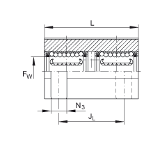 - 基本額定載荷僅適用于淬硬 (670+170 HV) 和磨削過的作為軌道的軸,而且兩個直線球軸承承受的載荷相同。