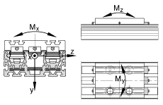 - 滑塊導軌系統的許用扭矩 這些數值是單一載荷,當執行器的下部完全被支承時使用。 當承受聯合載荷時,這些值必須減小。